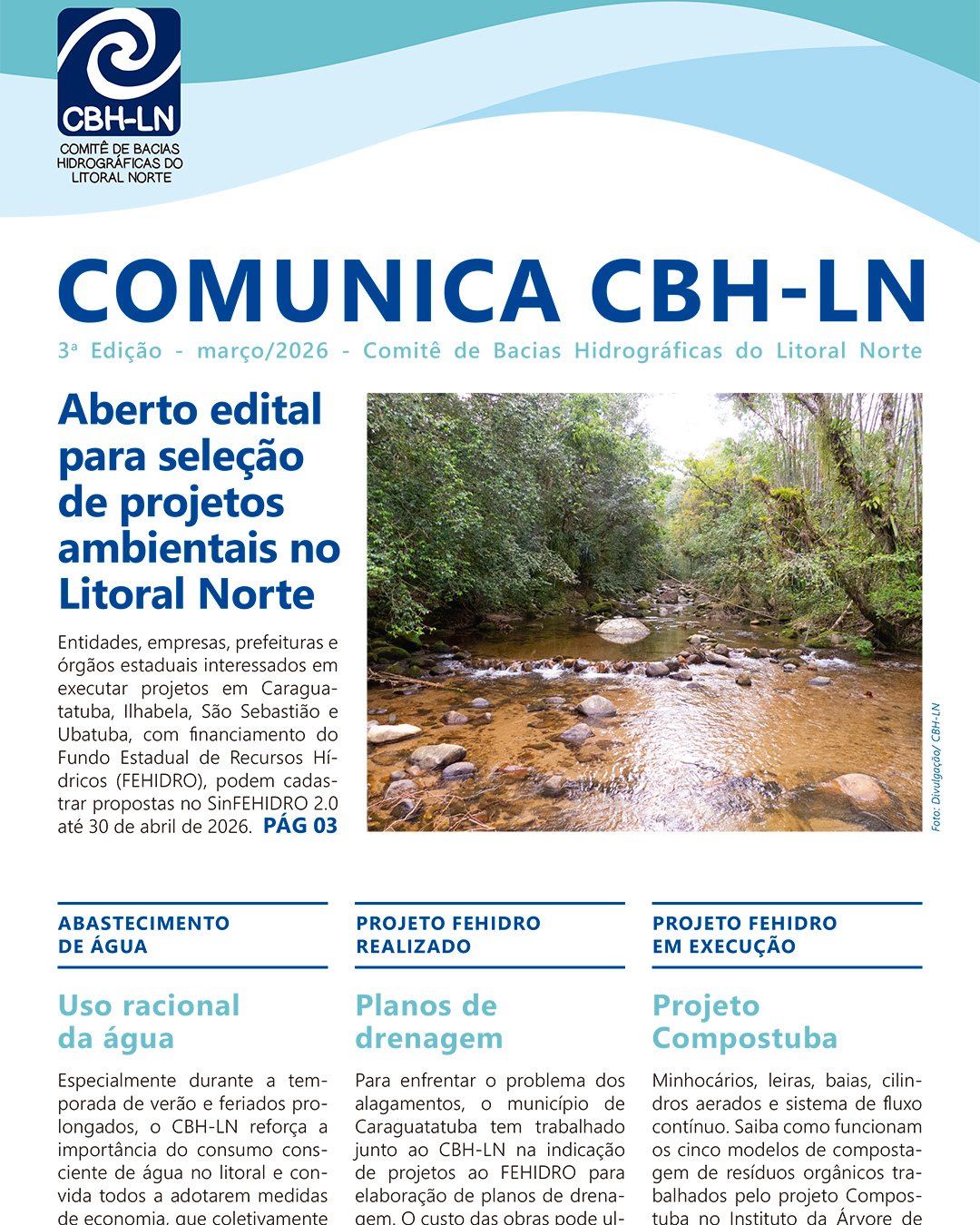 Acompanhe aqui os boletins informativos do Comitê de Bacias Hidrográficas do Litoral Norte. Neles, você encontra atualizações sobre projetos, deliberações e ações em andamento, além de conteúdos que aproximam a sociedade da gestão participativa das águas da nossa região.